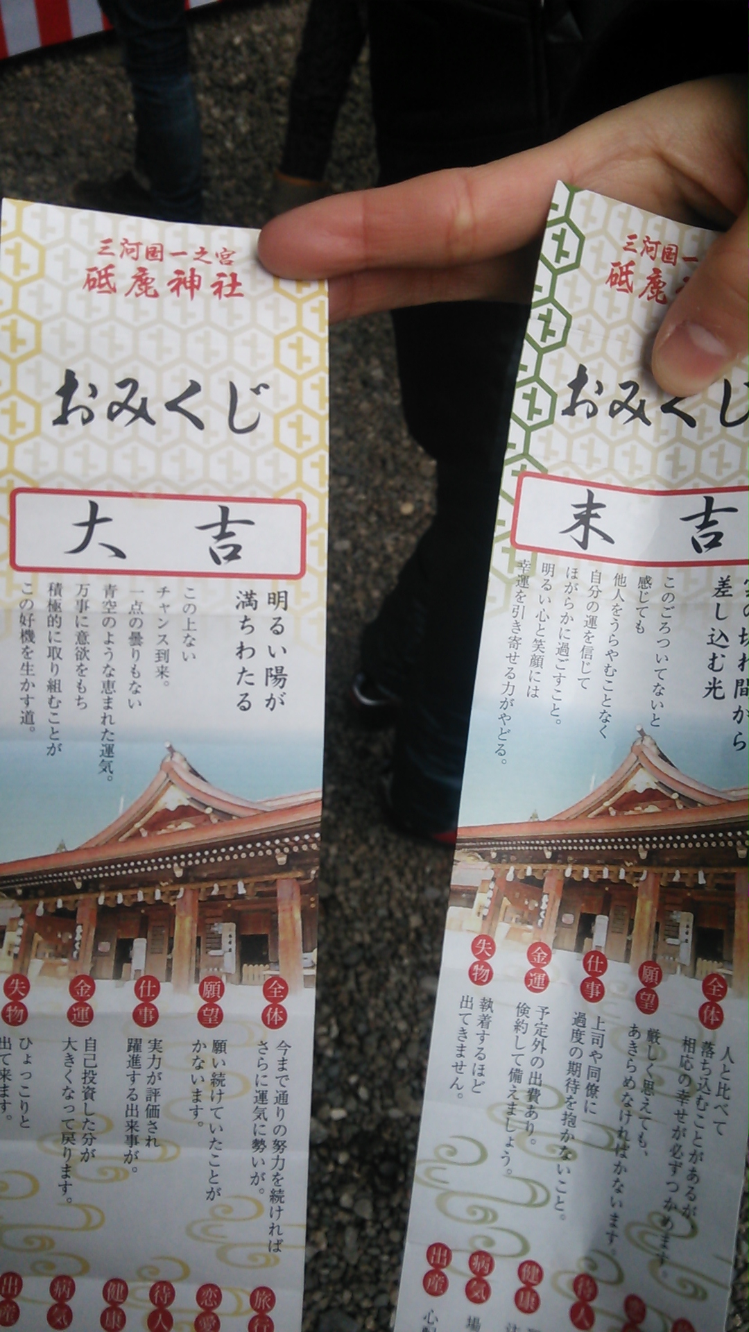 ここでお参りをし、おみくじを引くと大吉で、嫁は末吉でした。