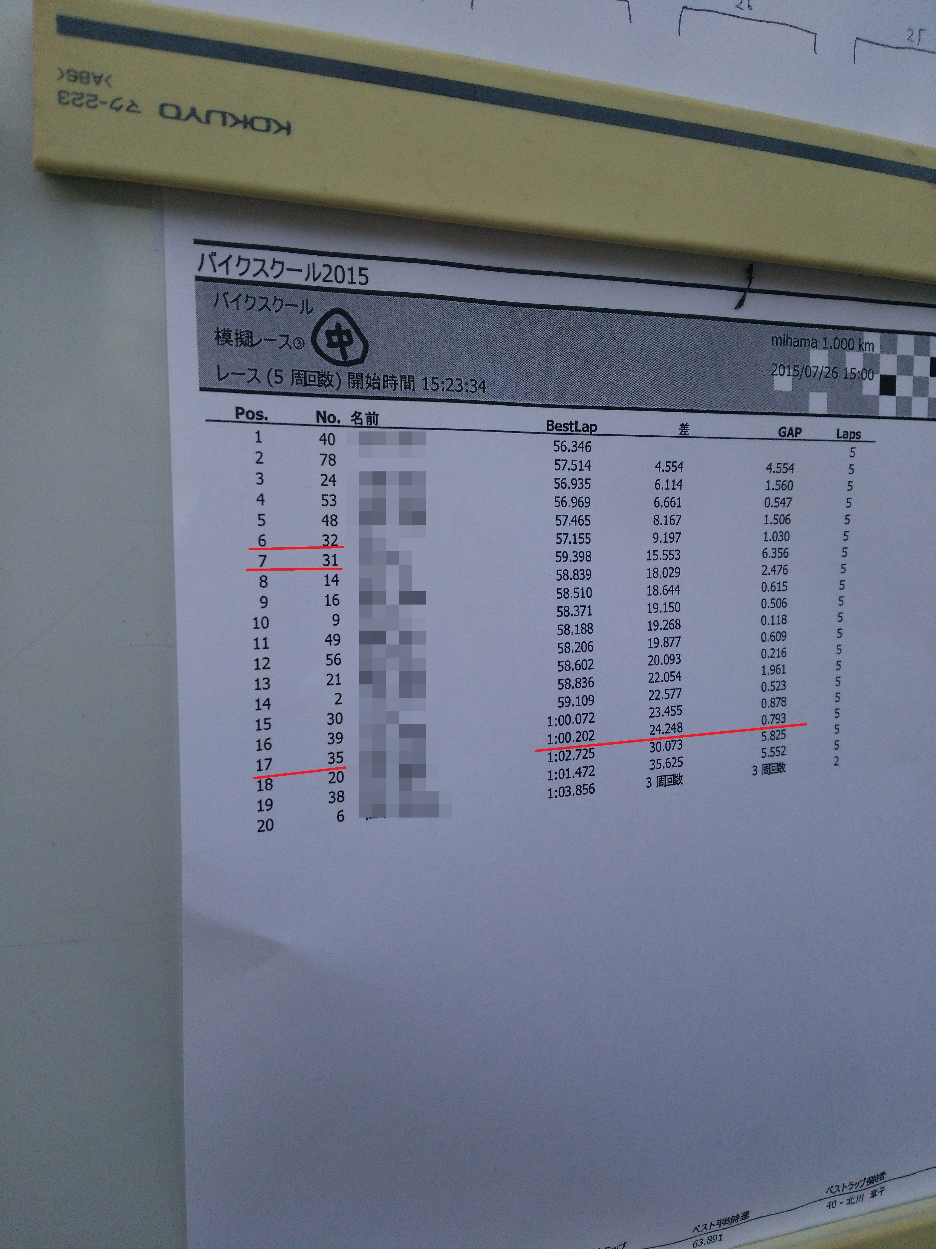 模擬レースの中級クラスのリザルトで上位の赤線はバイク屋さんのお客さんで、下のやつは自分です。