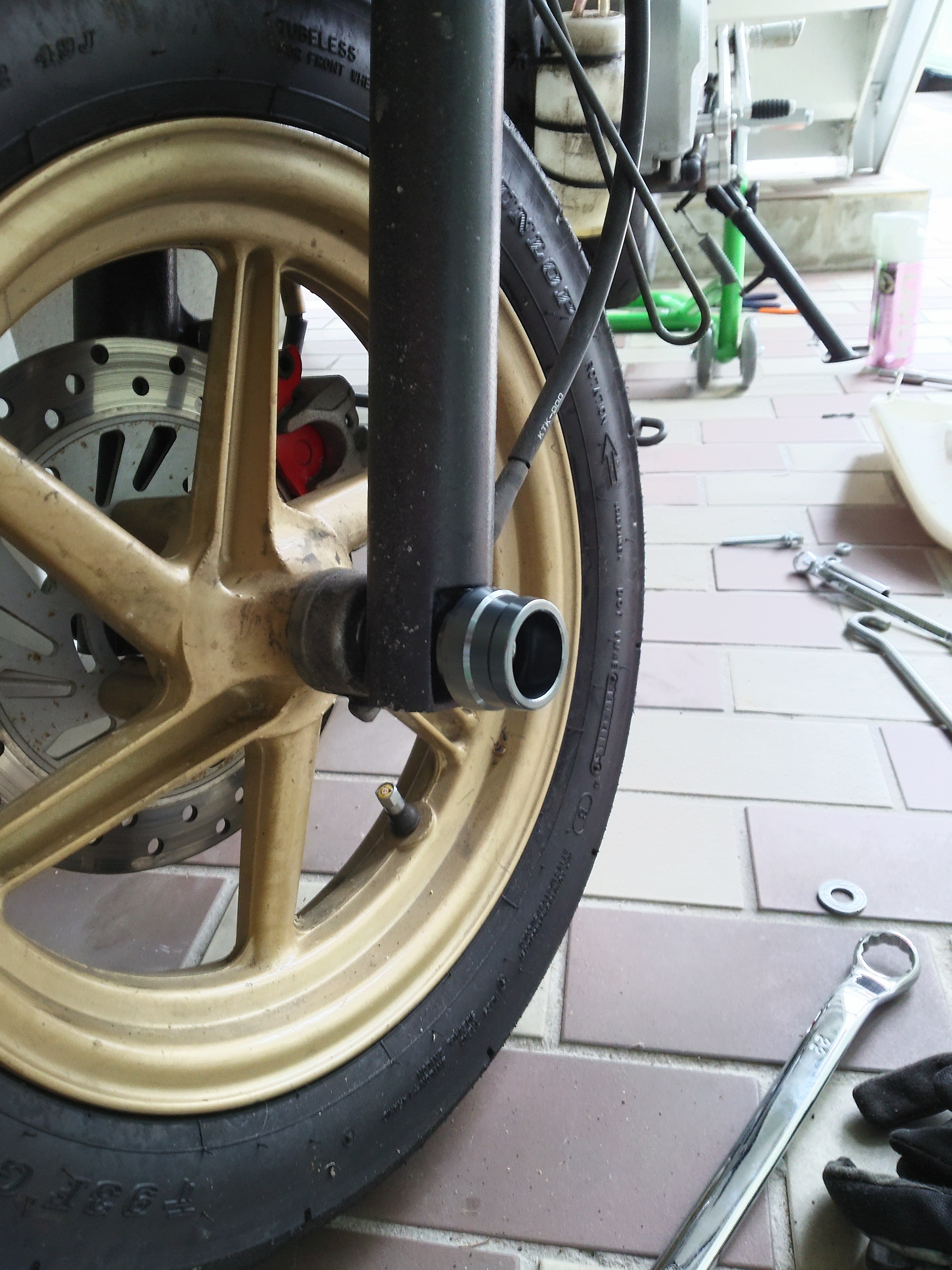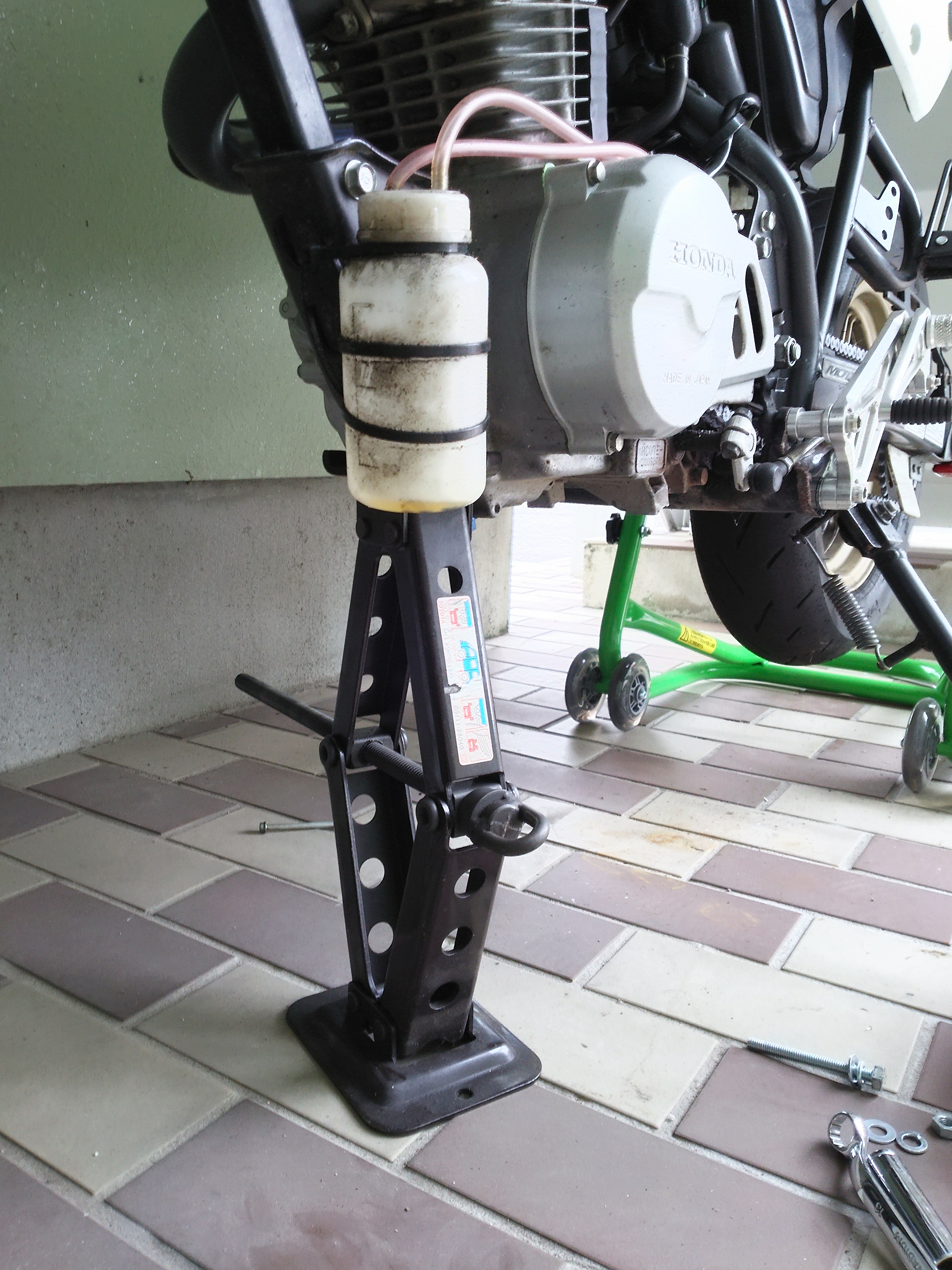 フロントも浮かせなければいけないので、アンダーカウルを外し、先日、前職場でパンタジャッキをぱくってじゃなくてもらってきたので、フレームにかって