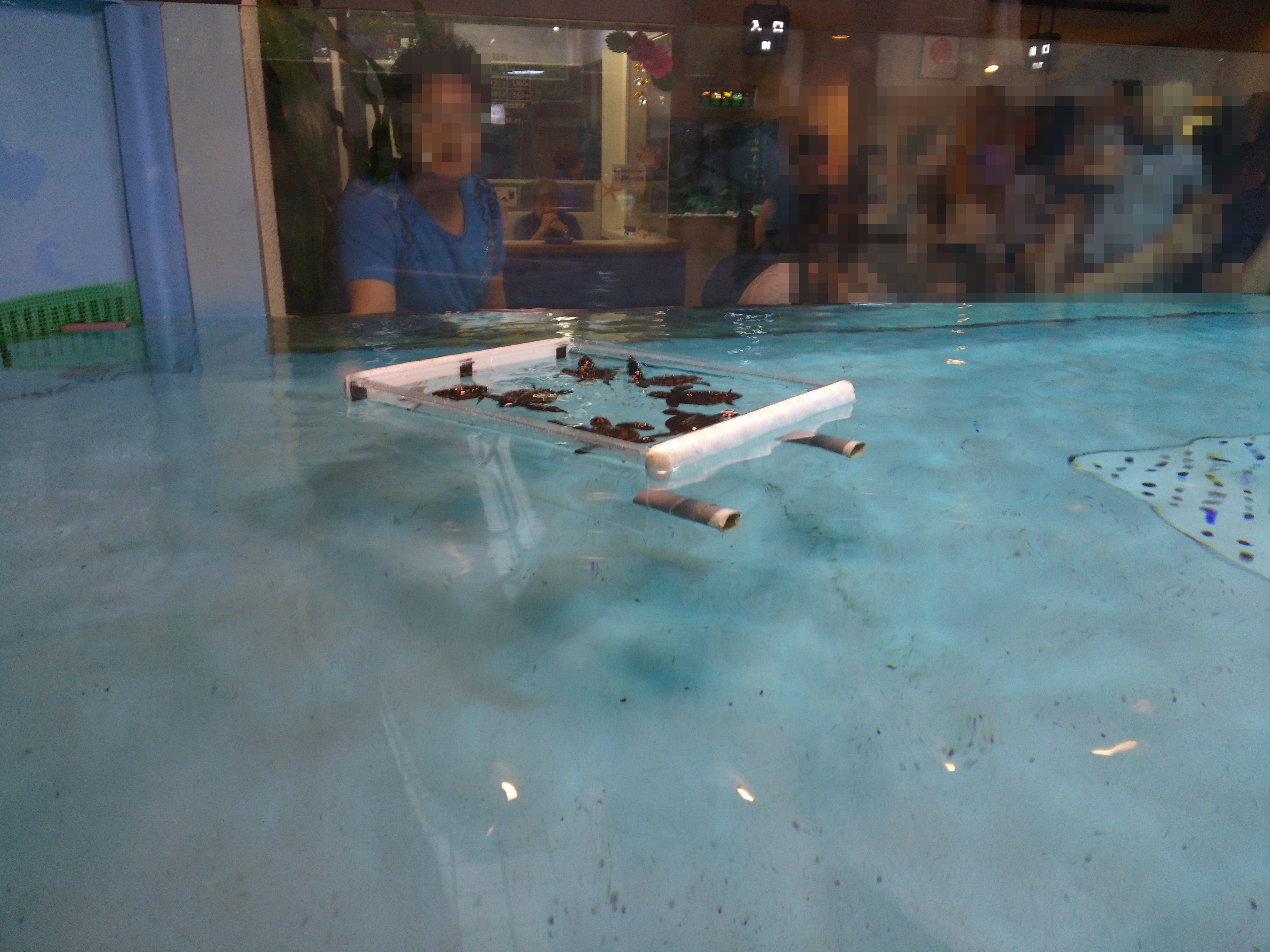 外に出るとウミガメの水槽があり、ちょうどエサやりをしていました。
