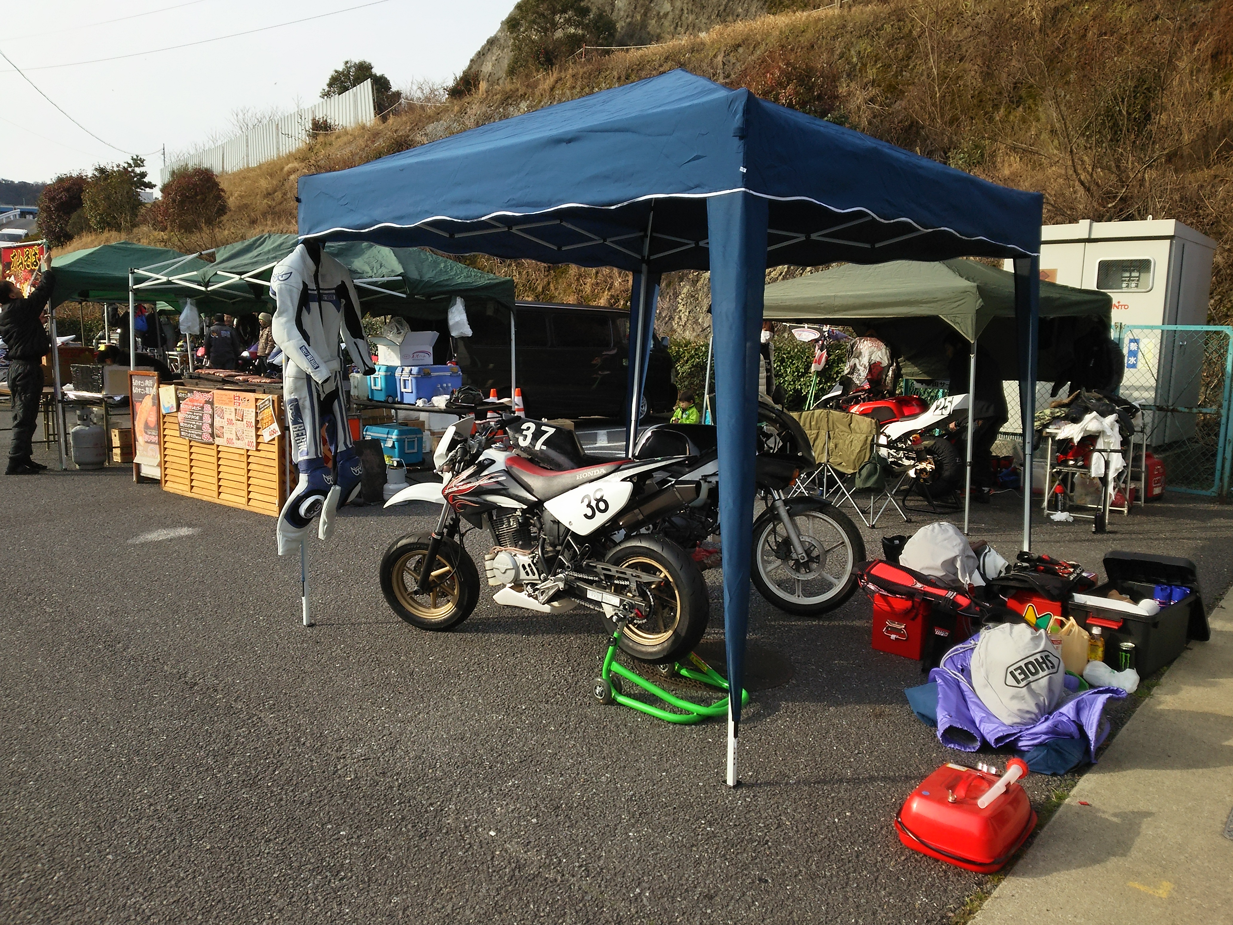 ピットにもまだ入れましたが、バイク屋さんのお客さんの若い子も来る予定だったので、テントを建てることにしました。