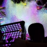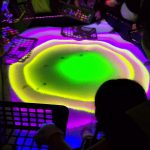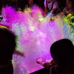 これは、言葉で説明すると難しいですが、小さい発泡スチロールの玉がたくさん入ったとこにピンポン球を投げると発泡スチロールが噴火して湧き出ながら虹色に変化する展示でした。