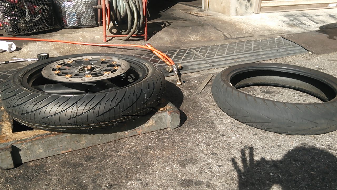 まずはZZRのFタイヤがご臨終だったので、交換しました。